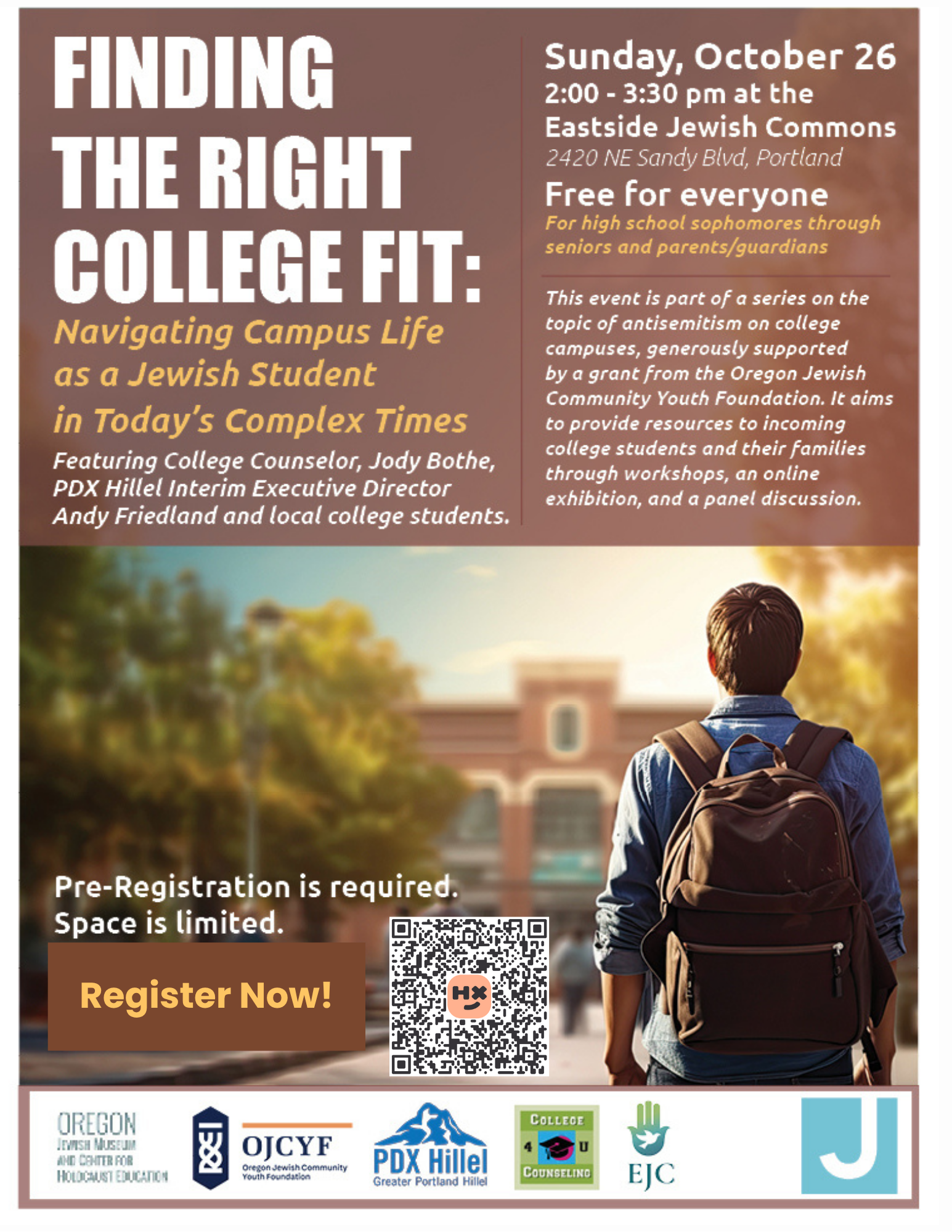 featuring College Counselor Jody Bothe and PDX Hillel Director Andy Friedland. Jody Bothe holds a Masters in Education form University of Vermont and a College Counseling certificate from UCLA, and has over 35 years of certified experience guiding students on the path of higher education.