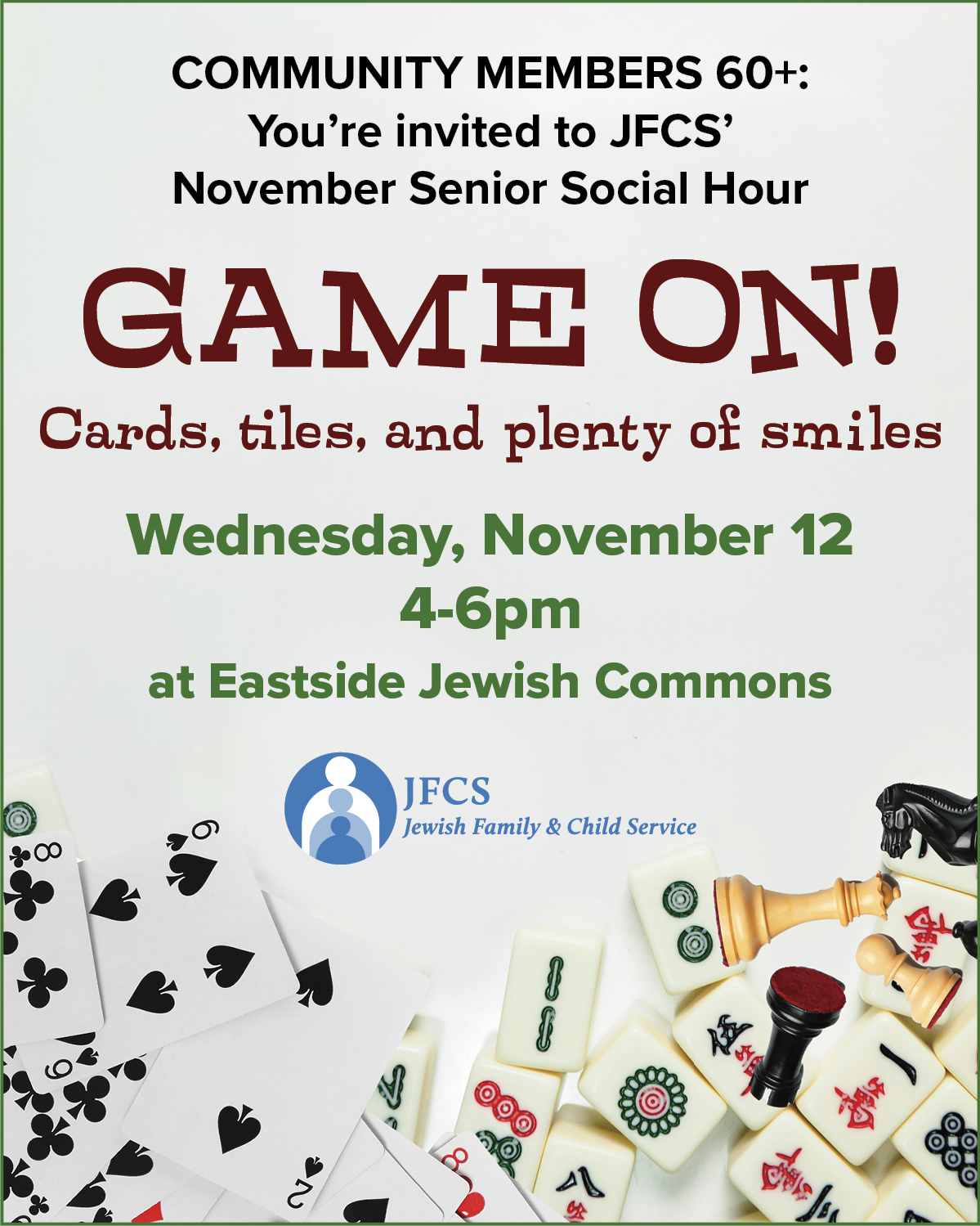 Community members 60+: You’re invited to JFCS’ upcoming Senior Social Hour on November 12th – an afternoon of play, laughter, and connection! Whether you’re a fan of Mahjongg, Rummikub, cards, or chess—or just curious to try something new—there’s a seat at the table for you. Bonus: a Mahjongg teacher will be on hand to guide beginners and share tips with seasoned players. Come for the games, stay for the friends! And feel free to bring along your favorite game to share.
